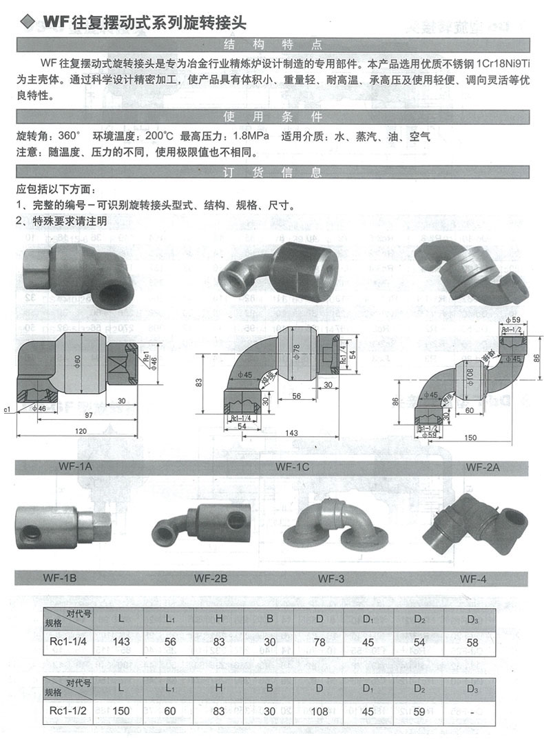 產(chǎn)品簡介:結(jié)構(gòu)特點: WF往復(fù)擺動式旋轉(zhuǎn)接頭是專為冶金行業(yè)精煉爐設(shè)計制造的專用部件。本產(chǎn)品選用優(yōu)質(zhì)不銹鋼1Cr18Ni9Ti為主殼體。通過科學(xué)設(shè)計精密加工,使產(chǎn)品具有體積小、重量輕、耐高溫、承高壓及使用輕便、調(diào)向靈活等優(yōu)良特性。 使用條件: 旋轉(zhuǎn)角:360° 環(huán)境溫度:200℃ 最高壓力:1.8MPa 適用介質(zhì):水、蒸汽、油、空氣 注意:隨溫度、壓力的不同,使用極限值也不相同。 ...