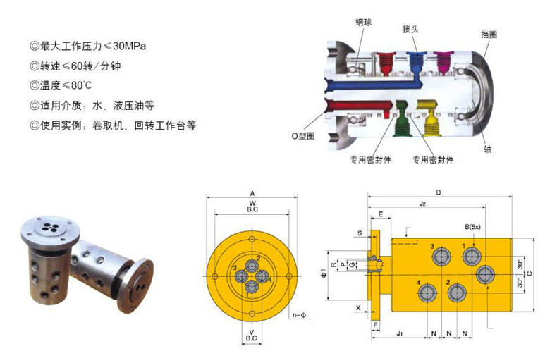 產(chǎn)品簡(jiǎn)介:最大工作壓力≤30MPa;轉(zhuǎn)速≤60轉(zhuǎn)/分鐘;溫度小于等于80℃;適用介質(zhì):水、液壓油等;使用實(shí)例:卷取機(jī)、回轉(zhuǎn)工作臺(tái)等。...